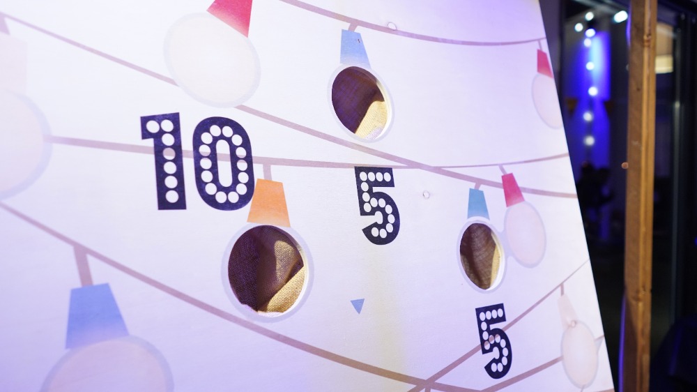 Pour créer cette ambiance singulière de fête foraine, nous avons conçu un podium avec de grands sapins gourmands servant de mat pour installer un plafond en étoile. Ce plafond se compose de fanions et de guirlandes guinguette marqueurs incontournables d’une fête foraine magique.